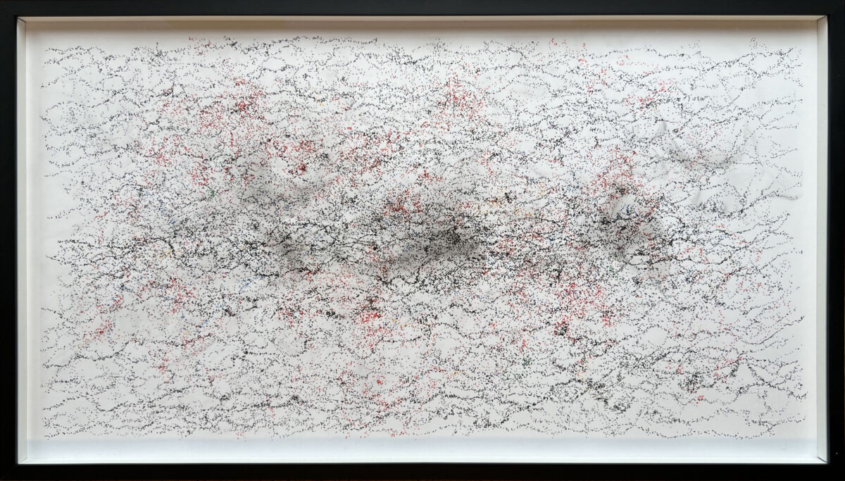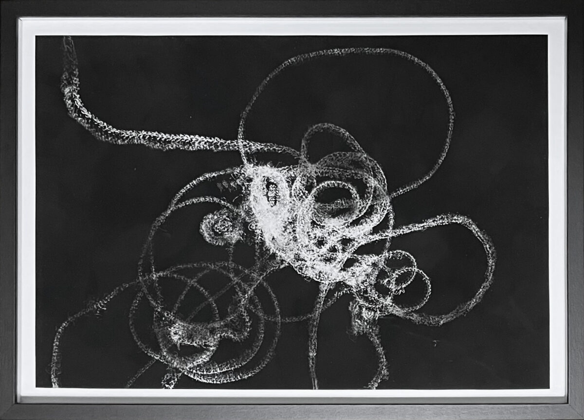 50 x 27 cm , Pigmentliner und Kampferrauch auf Papier, Distanzrahmen 1cm Alu schwarz, Museumsglas, 2026